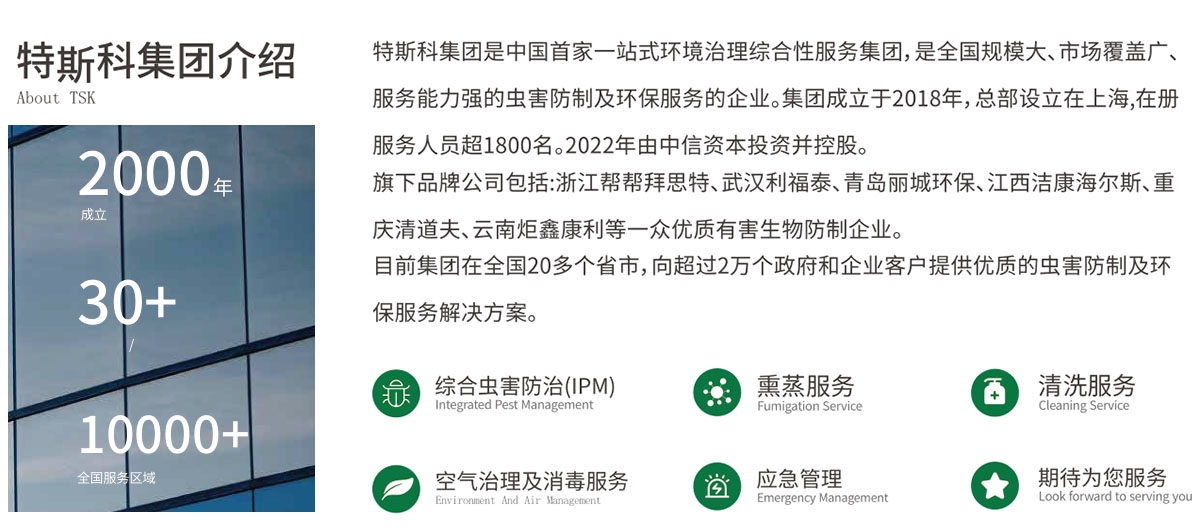 公司成立20年,立足于溫州地區(qū)及周邊城市,現(xiàn)公司在瑞安、蒼南、樂(lè)清、麗水、臺(tái)州、福鼎、福州、上海、南京、福州三明、金華等11處設(shè)分公司和辦事處,對(duì)各地區(qū)蟲害防制、城市創(chuàng)建服務(wù)做出長(zhǎng)遠(yuǎn)的貢獻(xiàn)。