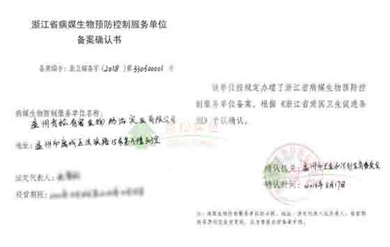 浙江省病媒生物備案證書
