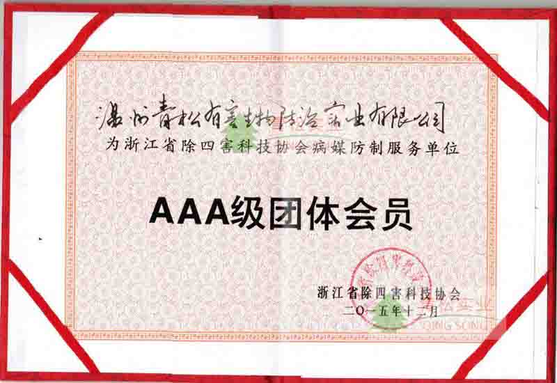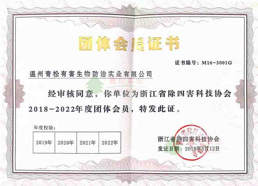 中國衛(wèi)生有害生物防治協(xié)會(huì)團(tuán)體會(huì)員證證書
