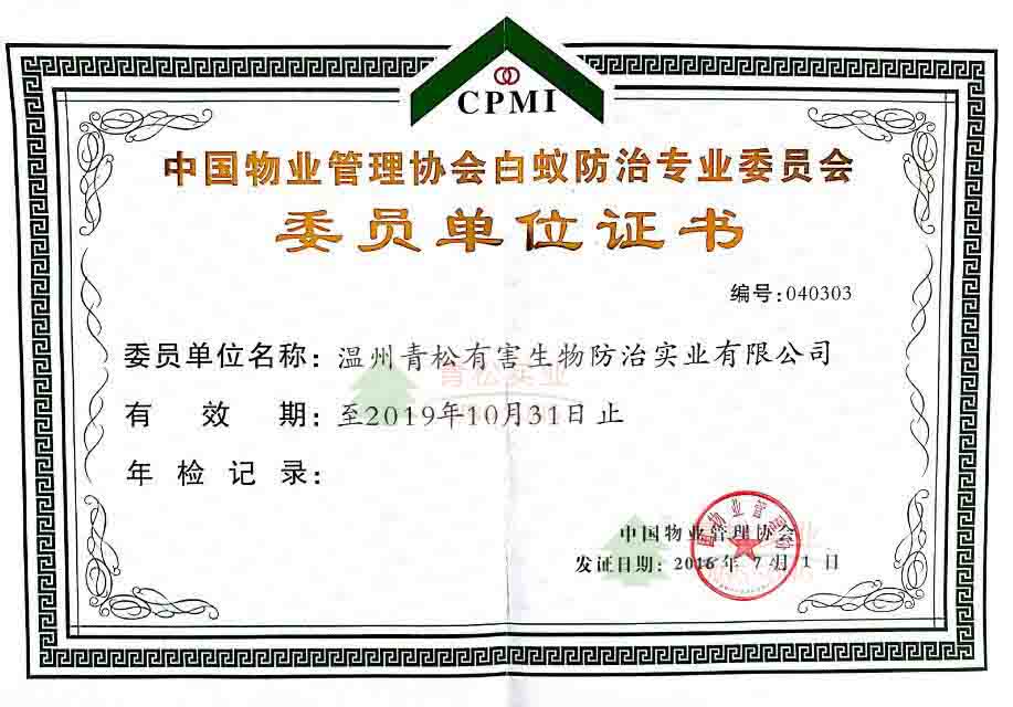 中國物業(yè)管理協(xié)會(huì)白蟻防治專業(yè)委員會(huì)委員單位證書